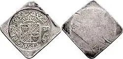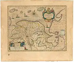 In 1595, the city of Groningen and the Ommelanden or surrounding regions come to an agreement to form a united domain (Dutch: gewest). The city already had direct control over the regions Gorecht, Oldambt, Reiderland, and Westerwolde. The Ommelanden were Hunsingo, Fivelingo, and Westerkwartier. A new coat of arms was designed for the domain.[1] More than 350 years later, on 30 December 1947, the coat of arms was formally approved by royal decree of Queen Wilhelmina.[1][2]
