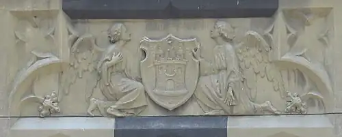 On the door of the tower there is a coat of arms (arms of the House of Portocarrero), which has some ornaments around it, as a bell it has an enhanced and open crown, on each side of the escutcheon there is a fleur-de-lis, and surrounding the coat of arms there are two lambrequins. These last two ornaments are not mentioned in the description of the royal decree.[12]