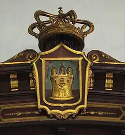 (...) and on it a coat of arms that has fifteen laces, seven blue and eight gold, and on its colonel that touches it (...). Said coat of arms corresponds to the coat of arms of the House of Portocarrero, an ancient and extinct Spanish noble house, whose primitive arms are squares (checkered) of 15 pieces, 7 blue and 8 gold, the coat of arms is in homage to Pedro Portocarrero y Aragón, Count of Medellín.[12] The term "colonel" in heraldry simply refers to a crown,[17][13] an expression that today is in disuse. The reading of colonel in an ancient document is that of a crown and it does not matter the type, because at that time there was no classification system and crowns of all types were made, but especially open ones. The crown before the seventeenth and eighteenth century is paraheraldic, it has no function other than decorative. In this case, the term "colonel" refers to the fact that the coat of arms has a crown of ornamentation as a bell.