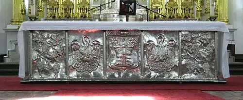 The escutcheon was also adopted by other entities such as the Archdiocese of Medellín, differentiated by the archbishop's cross on the seal and the name of the archdiocese as the motto.[1] Likewise, the arms of the city are also present in the first quarter of the emblem of the University of Medellín.[4]