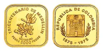 Both coins are of the same design, only the size and face value vary, they are made in gold law 0.900, are square in shape, and have the values of 1,000 and 2,000 Colombian pesos. The coin of the first value has a dimension of 17.5 x 17.5 mm and weighs 4.25 grams, and the second has 21 x 21 mm and weighs 8.5 grams.[31] On the obverse, the central figure is the "Coat of Arms of Medellín" flanked by olive branches; around the coat of arms, on the upper part is the legend "REPÚBLICA DE COLOMBIA" and on the lower part the years "1675 - 1975". On the reverse, the central figure is a bouquet of orchids, around it is the legend "TRICENTENARIO DE MEDELLÍN" at the top, and at the bottom is the value in letters and numbers, and "900/1000 ORO" indicating the purity of the metal.[31] A total of 8,000 pieces were minted, of which half were for 1,000 pesos and the rest for 2,000 pesos.[32] They are also the only two square-shaped Colombian coins.