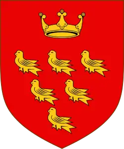 The blazon of the arms is: Azure six martlets three two and one and a chief indented or, and for a crest on a wreath of the colours a sprig of oak proper fructed with two acorns or within a Saxon crown also or.[10]