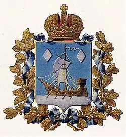 The coat of arms of Łomża Governorate depicted a small orange (golden) Kaffenkahn river boat with four paddles, a white (silver) sail and a naval jack on top of the mast. On each side of the boat, on the height of the mast, was placed a grey (silver) rhombus. The boat was put on a body of water. It was placed on a blue French-style escutcheon. Around the shield, there were yellow (golden) leaves of the oak tree, interspersed with the blue ribbon of the Order of St. Andrew. On the top of the coat of arms, above the escutcheon, there was the yellow (golden) Imperial Crown of Russia. The coat of arms was used until 1912, when the governorate ceased to exist.[2][4]
