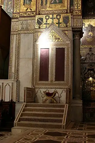In the Monreale cathedral, built precisely at the behest of King William, the said coat of arms appears reproduced in two specimens, which are part of a mosaic above the royal throne. In Testa's De vita, et rebus gestis Guilelmi II, also printed in Monreale, in 1769, a first engraving, which forms the volume's frontispiece, features a sculptural group, in which a portrait of the sovereign appears, below which is the octagonal star; while a second engraving, printed in the frontispiece, reproduces a coat of arms, set in an elaborate crowned frame, supported by three putti, two of which are winged, which is separated, first, from the band of two checkered rows, and, secondly, from the octagonal star.[35] The double reference to the city of Monreale makes it superfluous to point out that the civic coat of arms of Monreale is precisely composed of a gold octagonal star on a blue field.