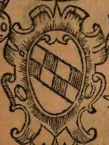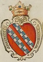 Another unusual reconstruction of the coat of arms can be found in the Regum Neapolitanorum vitae et effigies, a Latin-language volume that was printed in 1605: some of the plates accompanying the publication show a coat of arms attributed to the Hauteville as characterized, not by one, but by as many as two bends chequy.[22] Such a double-banded representation can also be found in the Großes Wappenbuch, an armorial compiled from 1583 in southern Germany: on a red field, the two bends chequy, each of two rows, are of azure and silver.[23]