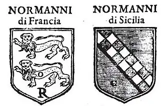 Agostino Inveges, on the other hand, makes no mention of the lion, but, as noted above, argues that, before the introduction of the coat of arms with the bend chequy, the Hauteville family also bore, as their own coat of arms, the crest of Normandy, that is, two leopards - beasts that by definition are passant - in gold, armed and langued in azure, placed in a pole on a red field;[1] an insignia, which to this day denotes the French region.