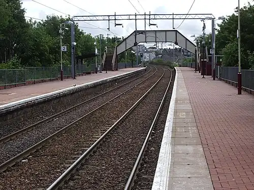 The station was opened as part of the Bathgate and Coatbridge Railway on 1 February 1871.[2] The station now has no structures other than simple shelters. The ticket hall that was built when the Airdrie-Helensburgh line was electrified in 1960 was demolished in the early 1990s. Similar structures, built in the same style, still survive at Easterhouse and Airdrie stations.