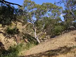 The park lies on the border between the dry northern Adelaide Plains and the wetter Mount Lofty Ranges. Based on climate measurements for nearby Parafield Airport, the park has an average rainfall of 465 millimetres (18 in), an average winter daily temperature range of 6.2—15.6 degrees Celsius and a summer range of 16.5—29.7.[7] Due to the risk of flooding after heavy rain, the park's waterways have been dammed, though they are dry for much of the year.[8] The park's topography ranges from steadily sloping in the west, to hilly in the east. Its lowest point, on the western edge along Bridge road, is 70 metres (230 ft) above sea level, rising to 215 metres (705 ft) at the Para Trigonometric Point in the park's southeastern corner. Flat land on the western side has red-brown soil with the remainder having Terra Rosas, Redzinas and fine-textured mallee soils.[9]
