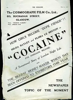 Cocaine is a 1922 British crime film directed by Graham Cutts and starring Hilda Bayley, Flora Le Breton, Ward McAllister and Cyril Raymond. It depicts the distribution of cocaine by gangsters through a series of London nightclubs. In it an innocent young woman called Madge runs away from her strict father, Montagu, who is secretly a drug kingpin. Madge escapes to her old school friend Jenny, who has become a cocaine addict. They head out to a nightclub where Madge is given cocaine by the owner, Min Fu, which Jenny is disturbed about. After desperately hunting his beloved daughter, Montagu finds her under the influence of cocaine, and kills the Min Fu in anger before being shot and killed by the police. Madge is saved by her boyfriend and Jenny, who ultimately finds redemption in the narrative by helping them escape the nightclub shootings before dying of a cocaine overdose in the final scene.[1]