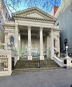 The first Baptist service in Melbourne was held in 1838 in a tent on a vacant allotment of land opposite the present church and where the Regent Theatre now stands. The first chapel was built on the current site in 1845. In the late 1850s it was decided to enlarge the building. The current church, opened in 1862, was designed by Reed & Barnes. Joseph Reed, was the architect who later designed the Melbourne Town Hall and several other prominent Melbourne churches. Unlike most Melbourne churches of the period, which are either Gothic or Romanesque, Collins Street Baptist is in the form of a classical temple, with four Corinthian columns facing the street.[1] According to the church's website, this "reflects the Baptist understanding of the church as a gathered community of believers rather than as a special building".