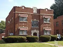 The apartment buildings in the Columbia Avenue Historic District are made up of 19 four to six-unit apartment buildings that were built between 1930 and 1939 and two similar structures built in the 1950s.[3] The buildings form a complex along city streets. Eight of the buildings face both sides of West Columbia Avenue, which runs through the middle of the district between Harrison and Ripley Streets. Three of the buildings flank Columbia facing Harrison. Four more building face West Hayes Street to the north, and six buildings face Ripley Street on the west.
