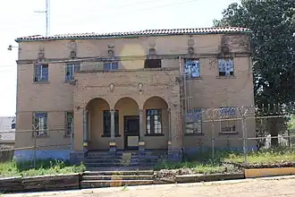 The Columbia County Jail is a historic structure at Calhoun and Jefferson Streets in Magnolia, Arkansas. The brick two story structure in Columbia County was designed by Thompson & Harding and was built c. 1920, and is an excellent local example of Italian Renaissance architecture. It is faced in cream-colored brick, and has a terracotta hipped roof. It has an entrance portico with round arches supported by slender columns and gargoyles at its corners.[2]