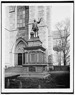 The statue was dedicated on October 21 in front of the Cathedral of the Holy Cross.[9][10] The ceremony took place for Columbus Day with a parade, followed by a procession where Captain Nathan Appleton revealed that the Governor of Massachusetts, the Mayor of the city of Boston, the Italian Consul, and the Collector of the Port of Boston had all appointed a committee to erect a statue to Columbus in the Public Garden but the project was never carried out because of a lack of funds.[13] The Sacred Heart Review praised the Buyens statue for being accomplished despite "the united energies of all those functionaries."[6]