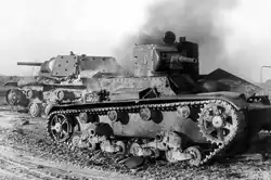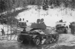 At the Battle of Tolvajärvi and afterwards, the Finnish managed to capture or destroy nearly 12 T-26 tanks during the defeat of the 75th Rifle Division.[38][39] At the battles of Suomussalmi and Raate, the Soviet 44th Rifle Division was encircled and lost all armour of its 312th OTB, including 14 T-26s.[36][40] Altogether, the Finns would capture almost 70 T-26 tanks of different models, including KhT-26 and KhT-130 flame-throwing tanks, during the Winter War, a number equal to the entire pre-war Finnish armoured force.[41]