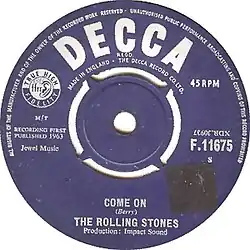 "Come On" was chosen as the Rolling Stones' debut single. Released in June 1963, it reached number 21 on the UK singles chart. The B-side was the Stones' arrangement of Willie Dixon's "I Want to Be Loved". Both songs were recorded on May 10, 1963. Other songs recorded on that day were "Love Potion No. 9" (unverified) and "Pretty Thing". "Come On" has been released on several compilation albums: More Hot Rocks (Big Hits & Fazed Cookies) (1972), Singles Collection: The London Years (1989) (together with its B-side), Singles 1963-1965 (2004) (together with its B-side), Rolled Gold+: The Very Best of the Rolling Stones (2007), GRRR! (2012) and Stray Cats, a bonus disc available only on The Rolling Stones In Mono box set (together with its B-side).[2]