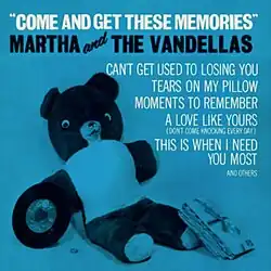 Come and Get These Memories is the debut album by the American girl group Martha and the Vandellas, released in 1963.[4] Put out by Gordy after the success of the trio's hit of the same name, the album also contains the group's debut single, "I'll Have to Let Him Go", which was originally intended for Mary Wells, and "A Love Like Yours (Don't Come Knocking Everyday)". Most of the album was produced by Holland–Dozier–Holland and William "Mickey" Stevenson.