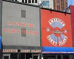 The most influential chili dog stands in Michigan are the American Coney Island and Lafayette Coney Island restaurants, located next door to each other in downtown Detroit.[10] The American Coney Island restaurant was founded in 1917 by Greek immigrant Constantine "Gust" Keros.[11] Gust brought his brother over from Greece, who opened a spite store location called Lafayette Coney Island next door in 1924.[10] There is a fierce rivalry between the two restaurants. The Lafayette Coney Island is no longer owned by a member of the Keros family. American Coney is owned and operated by a third-generation Keros.[11][10]