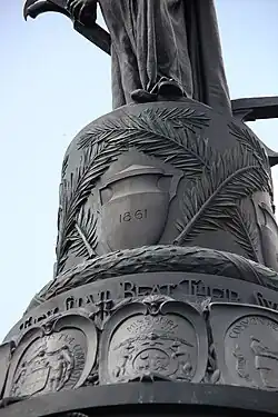 The figure stood on a round pedestal[128] decorated with palm branches and four cinerary urns. Low relief numbers on the urns refer to the four years of the American Civil War (1861, 1862, 1863, and "1864–65").[43] Beneath the round pedestal is a round plinth in the form of a wreath of wheat. Below the plinth is a round base on which is inscribed: "AND THEY SHALL BEAT THEIR SWORDS INTO PLOUGHSHARES AND THEIR SPEARS INTO PRUNING HOOKS."[141][126][43][138] It is a partial quotation from Isaiah 2:4.