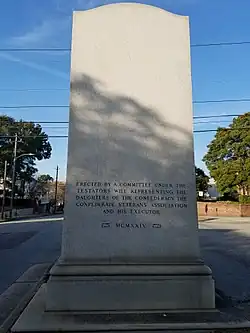 The Confederate Memorial was erected in 1924 by the estate of veteran Gabriel James Boney, the United Daughters of the Confederacy, and a Confederate veterans association in downtown Wilmington, North Carolina.[1] In August 2021, the City of Wilmington removed it from public land and stored it, awaiting the UDC chapter to take possession.
