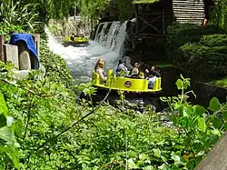 The rapids comes close to the Runaway Mine Train as it passes through the tunnel. It features twin waterfalls, and boats pass between the two waterfalls, along with three wave machines positioned at strategic points around the ride.