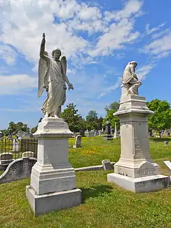 In 1864, an explosion at the nearby Washington Arsenal killed a woman supervisor and 20 teenage girls, most of them Irish, who worked packing explosives and cartridges. President Lincoln led the funeral procession to the cemetery and attended the graveside ceremonies. Later a monument was erected over the graves of 16 of the victims. A sculpture of a grieving young woman stands atop a marble column on the monument.[8] Local artist Lot Flannery, of the Flannery Brothers Marble Manufacturers, sculpted the monument.[9][10]