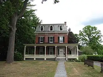 This distinctive brick house was built in 1840 with Greek Revival features, but was remodeled in 1870 with a Second Empire style mansard roof. Ithmar Conkey, for whom it was built, was a prominent local lawyer and businessman, who was also active in regional civic affairs. In 1868, it was acquired by Abiel Stevens, whose wife was the sister-in-law of Sidney Dillon, an executive of the Union Pacific Railroad. Their son Albert worked for the railroad, and used his earnings to refashion the house in the Second Empire style. The house remained in the Stevens family until 1977.[3]