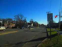 Route 154 soon turns north, passing just to the west of North Cove. It then becomes concurrent with US 1 prior to intersecting I-95 as the Middlesex Turnpike. Proceeding north, it intersects Route 9 before passing near South Cove, a separate cove than the one previously crossed over, although they are both an extension of the Connecticut River.[4] It then intersects Route 9 again, before turning slightly east of north, and intersecting it for a third time. It then becomes known as Main Street while traveling parallel to the Connecticut River. It then intersects Route 148.[5]