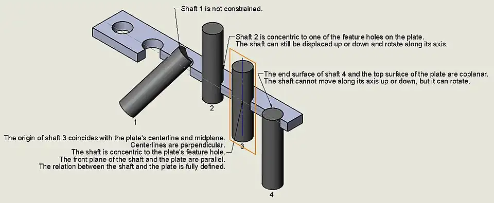 Ideally, a rod will need to be concentric to a hole drilled through the plate where it will be inserted, so the constraint "concentric" guarantees that the diameter of the rod and the diameter of the hole maintain a common centerline, thus "locking" the manner the rod relates to the hole in the plate; this means that the rod could still slide on either direction since the position of its ends has not been limited. Instance 2 illustrates that the rod may still rotate along its centerline while it slides up or down.