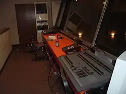 The control booth, control room, lighting box, technical booth, tech booth, or just booth used by television, film or theatrical technicians is the area designated for the operation of technical equipment (lighting and sound), lighting controls and sound board, while the control booth in industrial operations is used to house employees and sensitive equipment in all types of locations such as process control pulpits, loading racks, dredge cabs, loading docks and more.[1] Often one or two followspots may be located in the booth as well. In a theater, it is generally an enclosed space with a large sliding window with a good view of the stage centered in the back of the house. It may be on the ground floor or at the balcony level. In a film or television production, it might be in a trailer or other space near the studio.[2][3]