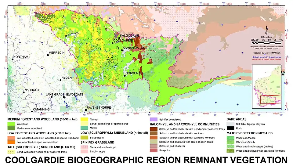 The Coolgardie bioregion, together with the coastal Hampton bioregion to the southeast, constitute the Coolgardie woodlands ecoregion defined by the World Wildlife Fund.[3]