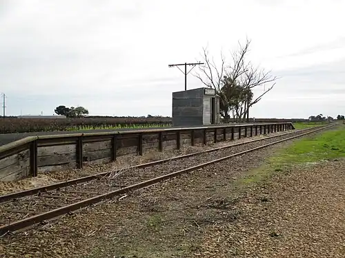 Coonawarra railway station opened on 14 June 1887 when the railway line was extended from Naracoorte south towards Mount Gambier.[1] The railway siding was built in 1898 by John Riddoch.[2] It consisted of a platform and a shed for passengers.