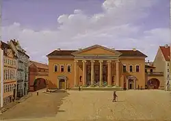 In the Great Fire of 1795, Copenhagen's city hall, located between Nytorv and Gammeltorv, was among the many buildings lost to the flames.[2] It was the second consecutive city hall at that spot to meet this fate; the first building, built in 1679 at the same site, had been lost in the Fire of 1728.[3]