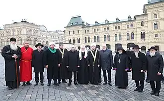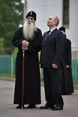 During this period, Metropolitan Cornelius actively visits communities in the regions and often meets with representatives of local municipal authorities and the press. Representatives of the Russian Orthodox Old-Rite Church began to take part in various cultural, historical, spiritual and educational events. Conferences, round tables, exhibitions, and educational lectures are held on an ongoing basis in the Russian Orthodox Old-Rite Church. Book publishing has increased. Old Believers (and some non-Old Believers) authors and scientists were involved.[39] The efforts of Metropolitan Cornelius to establish closer relations with the state authorities were crowned with success. Local authorities in Russia, to a greater extent than before, assist Old Believer communities in the restoration of churches, the allocation of land for the new construction of religious buildings. Representatives of the Old Believer communities and the diocese, along with delegates from other faiths, are members of regional councils for interaction with religious organizations.[38] On February 22, 2013, Russian President Vladimir Putin awarded Metropolitan Cornelius the Order of Friendship. In his reply, Metropolitan Cornelius said: "In this high award, I see not so much an appreciation of my modest merits, as a recognition by the state of the merits of the entire Russian Old Believers to their Fatherland in preserving the spiritual wealth of Holy Russia".[40] On July 28, 2014, during his visit to Altai, Metropolitan Cornelius met with the Governor of Altai Krai, Alexander Karlin, in Barnaul.[41] On May 27, Metropolitan Cornelius met in Vladimir with Svetlana Orlova, Governor of the Vladimir Oblast.[42] On July 22, Acting President of Tatarstan Rustam Minnikhanov received Metropolitan Cornelius at his residence in the Kazan Kremlin.[43][44] On March 16, 2017, Metropolitan Cornelius held an official meeting with Russian President Vladimir Putin, which was the first official meeting of its kind in the centuries-old history of the Old Believers.[45] During the meeting, the upcoming celebration of the 400th anniversary of the birth of Protopop Avvakum and the reconstruction of architectural monuments in the main celebration centers - at the Rogozhsky and Preobrazhensky cemeteries in Moscow, interaction with compatriots abroad and the return of the Russian Orthodox Church of the Intercession and Assumption of the Mother of God in Maly Gavrikov Lane in Moscow were discussed.[46] On May 31, 2017, President Vladimir Putin visited the Rogozhsky Administrative and Spiritual Center. The President visited the Church of the Nativity of Christ, the Pokrovsky Cathedral, the Icon Museum in the House of the Clergy, after which he communicated with Metropolitan Cornelius, later called this visit historic and noted that "the head of state visited the spiritual center of the Orthodox Old Believer Church for the first time after the church schism".[47] On May 25, Sergei Kiriyenko, First Deputy Head of the Presidential Administration, paid a working visit to Rogozhskoye.[48] On June 1, 2017, Moscow Mayor Sergei Sobyanin visited the spiritual center of the Russian Orthodox Church to congratulate Metropolitan Cornelius on Name Day.[49] On August 1, a meeting with Chairman of the State Duma Vyacheslav Volodin took place at the Rogozhsky residence.[50] On August 16, 2017, Russian Minister of Culture Vladimir Medinsky visited the Rogozhsky Spiritual Center.[51]