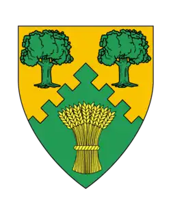 Per chevron embattled Or and Vert, in chief two oak trees and in base a garb counterchanged.[14] | |