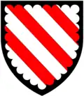 Argent, three bendlets gules a bordure engrailed sable | |