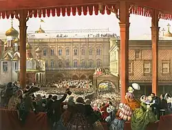 Following his entry into the city the new Tsar and his entourage took time to rest and prepare for the following day's ceremony, while heralds in medieval clothing read out special proclamations to "the good people of Our first capital".[19] Receptions were held for foreign diplomats, the Banner of State was consecrated, and the imperial regalia were brought from the Kremlin Armoury to the throne hall for the procession to the cathedral.[24] In conjunction with the Tsar's entry into Moscow, fines were remitted, prisoners pardoned, and a three-day holiday was proclaimed.[25]