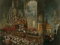 The coronation of the emperor of Russia (generally referred to as the Tsar) from 1547 to 1917, was a highly developed religious ceremony in which he was crowned and invested with regalia, then anointed with chrism and formally blessed by the church to commence his reign. Although rulers of Muscovy had been crowned prior to the reign of Ivan III, their coronation rituals assumed overt Byzantine overtones as the result of the influence of Ivan's wife Sophia Paleologue, and the imperial ambitions of his grandson, Ivan the Terrible.[1] The modern coronation, introducing "Western European-style" elements, replaced the previous "crowning" ceremony and was first used for Catherine I in 1724.[2][3] Since tsarist Russia claimed to be the "Third Rome" and the replacement of Byzantium as the true Christian state,[4] the Russian rite was designed to link its rulers and prerogatives to those of the so-called "Second Rome" (Constantinople).[5]