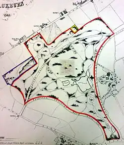 The first steps toward the establishment of the park were taken in 1845 when a sum of £4701 19s 7d was raised towards the purchase and implementation of the park by the sale of land on the town's moor.[9] The 50 acres (200,000 m2) for the park were secured in January 1855 with the purchase by the then Mayor, Thomas Dugdale, for the Corporation, from Joseph Feilden for £3,237 6s 3d. at £65 per acre.[10] Blackburn Corporation was also required to build public roads on the east and west sides of the estate (now East and West Park Roads) at an eventual cost of £4,480 17s 1d.[10] In 1855 work commenced on the Preston New Road entrance by Roberts and Walmsley, awarded the contract to build the arch and lodge at a cost of £789.[9] The East and West lodges were constructed at this time. In 1857 three of the four fountains in the park built and paid for by Mayor William Pilkington, including the largest at the main entrance built by Varley's of Blackburn. The fourth fountain, which stands in the stream running down from the main lake, was built later than the others and was paid for by John Dean. It is made of slate and is of a simpler design than the others.[7] In 1857 two Russian cannons captured from Sevastopol during the Crimean War presented to the town as a Trophy by Lord Panmure, the Secretary of War.[9] These were mounted on a stone-faced battery at the top of the park. By its opening the total cost of the park was £14,701 19s 1d.[10]