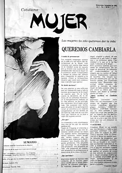 The magazine Cotidiano Mujer was founded by Lilián Celiberti, Elena Fonseca, and Anna María Colucci at the end of the civic-military dictatorship of Uruguay, when Celiberti was released from prison.[1][2] At that time there was a political and social effervescence linked to the democratic transition which facilitated the public visibility of a second feminist wave that was emerging in the country. This new feminist agenda sought to advance beyond formal civil and political rights, to examine the problems of everyday life, such as the distribution of work and power within families.[3]