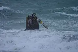 During major storm activity on 21–22 May 2009, the spike was knocked off the pylon.[14] However this is not the first time this has occurred;[15] during storms in 1995, the spike was also knocked over. It then remained on the bottom of the ocean in approximately 3 metres (9.8 ft) of water until a group from Swanbourne Nedlands Surf Life Saving Club removed the 800-kilogram (1,764 lb) structure using nothing but wood, rope and surfboards[16] in 1997.
