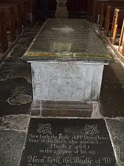 Sir Robert died on pilgrimage to the Holy Land in 1518 leaving in his will money for the depiction of Doom in stained glass in the East window, the Seven Sacraments in the North chapel and the Seven Acts of Mercy in the South chapel.[12] Fragments of these appear to be scattered amongst the jumbled glass in some of the aisle windows.[9] The survey of the clergy by the puritans in 1586 described the then vicar, Thomas Penford as; "dumbe & vnlearned, a verie aged man, he can scarce reade, yet he hath learning enough for 2 benefices; for he reapeth the fruite of Studley & Coughton both, he hath of late gotten him a certaine hireling to serue his turne at both places, one Robt. Cathell a seelie Welshman that can scarce reade English distinctlie. The valew of both is better then xx by the yeare".[13]