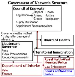 The Council of Keewatin was an unelected legislative body and territorial government for the now defunct District of Keewatin in Canada. The District of Keewatin was created by the passage of the Keewatin Act on October 7, 1876[1] from a portion of Canada's North West Territories.[A] Lieutenant Governor Alexander Morris convinced the government that the new territorial government of the North West Territories would be unable to effectively administer land to the north and east of Manitoba.[2] Shortly after the District of Keewatin was formed a large group of Icelanders arrived, infected with smallpox which quickly spread to the indigenous First Nation population. The Government of Canada allowed the Council to be formed for the purpose of containing the smallpox epidemic. The Council also administered Indian treaty claims, immigrant land claims, Hudson's Bay Company trading post concerns as well as policing and health care. The Council lasted from November 25, 1876, until April 16, 1877, after which control of the territory was returned under federal authority.