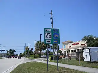In the 1990s, the Florida Department of Transportation removed the State Road from several routes in the Stuart area, including SR 707A. Jensen Beach Boulevard was then redesignated County Road 732, not to be confused with SR 732, which is the nearby Jensen Beach Causeway. However, conflicting signage on Jensen Beach Boulevard indicates it is part of SR 732, CR 732, as well as County Road 707A. At its westernmost intersection with US 1 it is signed CR 732.[6] At an intersection with Royal Park Drive, the road is signed as SR 732 on a green street sign.[7] At Savannah Road (CR 723), a green sign depicts this intersection as the eastern terminus of SR 732 and the western terminus of CR 707A. (see image at left)