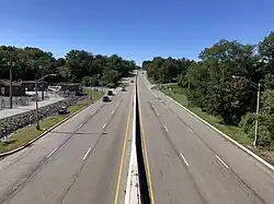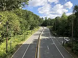 Upon crossing the Passaic River, CR 510 enters Livingston in Essex County and becomes four-lane undivided South Orange Avenue as it runs through wooded areas with some business parks. After an intersection with the southern terminus of the Eisenhower Parkway (CR 609), the route becomes a divided highway again and passes between the Livingston Mall to the north and a branch of Cooperman Barnabas Medical Center to the south. After crossing CR 607, the road becomes undivided again and passes to the south of residential neighborhoods before running through dense forests. In this area, CR 510 crosses CR 649, where it is briefly a grade-separated divided highway, before becoming undivided and crossing CR 608. From here, the route enters residential areas and crosses into Millburn, coming to the junction with CR 527. A short distance past CR 527, the road heads east into the forested South Mountain Reservation, a part of the Watchung Mountains. In this area, the road becomes a divided highway again and crosses the West Branch of the Rahway River into Maplewood. The route passes under a bridal path and winds southeast through the reservation (known locally as the "S Curves"), becoming the border between South Orange to the north and Maplewood to the south as it leaves the South Mountain Reservation and enters residential areas.[1][4] A $30 million project to rework the "S curves" for safety and drainage is in progress.[5]