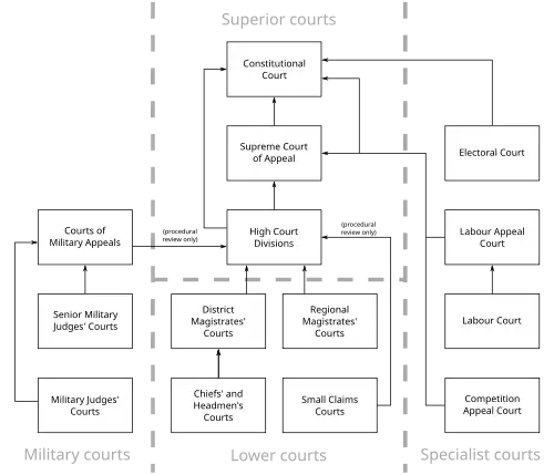 Specialist courts have been established for various matters, including Labour Courts, the Land Claims Court, Special Income Tax Courts, and the Electoral Court. African customary law is administered by chiefs' and headmen's courts, subject to the National House of Traditional Leaders.