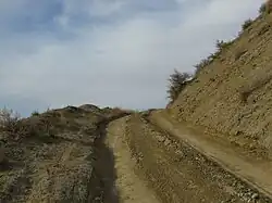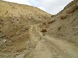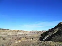As for the old freight trail that went upstream from the mouth of Cow Creek, there is no longer any road to speak of in the first 15 miles. The multiple creek crossings of the old Cow Creek trail have been eroded away into cut banks, and the gravel bars where the wagons crossed have been swept down stream. Here and there the remnants of the old Cow Creek Trail can be observed along Cow Creek but it is sketchy.[9] Upper Cow Creek is not so isolated. About 15 miles up from the Missouri, where Davidson Coulee flows into Cow Creek, Blaine County Road 330 (Cow Creek Trail) drops down Davidson ridge to Cow Creek Bottom from the west. One ranch is located near this point. The name "Cow Island Trail" is still applied to the road that goes from the junction of Cow Creek and Davidson Coulee up to the bench and on to the west, and this is probably the same route that the original Cow Island freight trail followed as it went on to Ft. Benton. Above Davidson Coulee Cow Creek is paralleled by Blain County Road 314 (Birdtail Road) for about 6 miles (10 km). In the upper reaches of Cow Creek a County road (Birdtail Road) descends to a second ranch. Blaine County Road 300 crosses Cow Creek at it upper end, near the forks of West and East Cow Creek, just under the southern flank of the Bears Paw Mountains.[10]