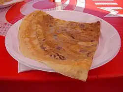 The Crêpe bretonne (krampouezenn in the Breton language) is a traditional dish in Lower Brittany, a region of France. It can be served plain, or with sweet or savoury fillings. The Crêpe bretonne can be made of wheat (sweet crêpe) or buckwheat (savoury crêpe). The latter is less well-known and should not be confused with the buckwheat pancake typical of Upper Brittany, which has a different recipe.