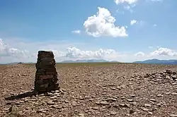The summit bears an Ordnance Survey triangulation column, set on a stony plateau. The view is excellent, although robbed of some foreground by the flat expanse of the top. All of the major fell groups can be seen with the Scafells particularly fine. Although a higher neighbour, Grasmoor detracts little from the view to the west.[3][4]