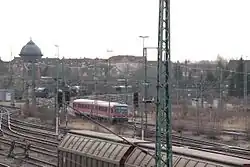 Crailsheim station is a junction station in the German state of Baden-Württemberg where four railway lines converge. It lies at the 30.4 km point (from Goldshöfe) on the Upper Jagst Railway, with the chainage continuing on the Hohenlohe Railway. The chainage on the Tauber Valley Railway and the line to Nuremberg starts at the station. With its four platform tracks and numerous passing tracks and sidings, it is the largest station in the district of Schwäbisch Hall. It is by served by Intercity and regional trains, and is the western terminus of line S4 of the Nuremberg S-Bahn.[5]