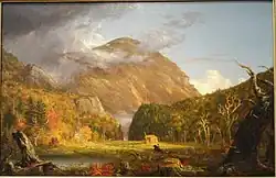Ethan knew how to exploit the attractions of the scenery to his best advantage, one example being that he took to greeting visitors by firing a cannon or blowing a horn at his door so that they could appreciate the natural echo.[28][29] The number of visitors increased greatly following a natural disaster on August 28, 1826, that was publicized by Dwight in his Northern Traveller guidebook. A summer storm converted the Saco River into a raging torrent through the Notch valley and triggered landslides. The Willey family, who had taken occupation of the Old Notch House, died trying to outrun the water and the terrain was stripped bare, remaining that way for many years after with the house still standing in stark contrast to the desolation. Natural beauty and tragedy combined to entice visitors with an interest in morbid Romanticism and to inspire artists such as Thomas Cole.[1][25] Dona Brown believes that Cole and such other visitors as Nathaniel Hawthorne used the interest in the tragedy to further their careers, deliberately painting and writing about an area that had suddenly gained national attention. Ethan, too, exploited it by, for example, ensuring that the Willey House was well signposted.[30][g]